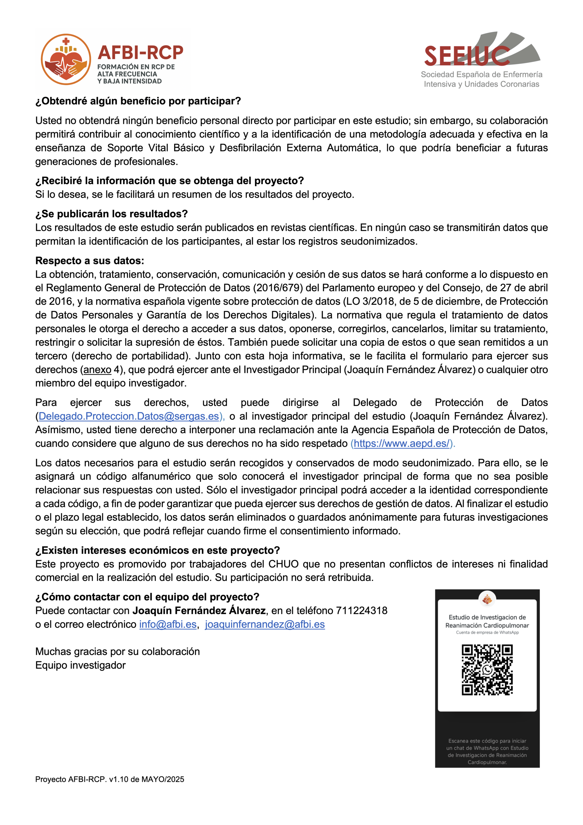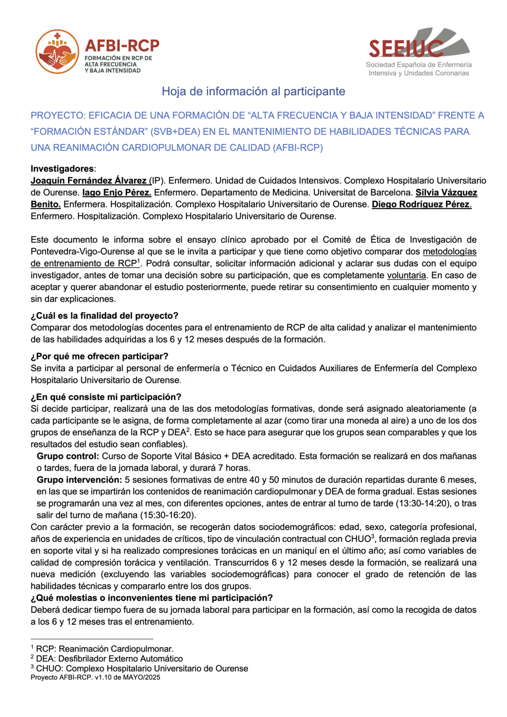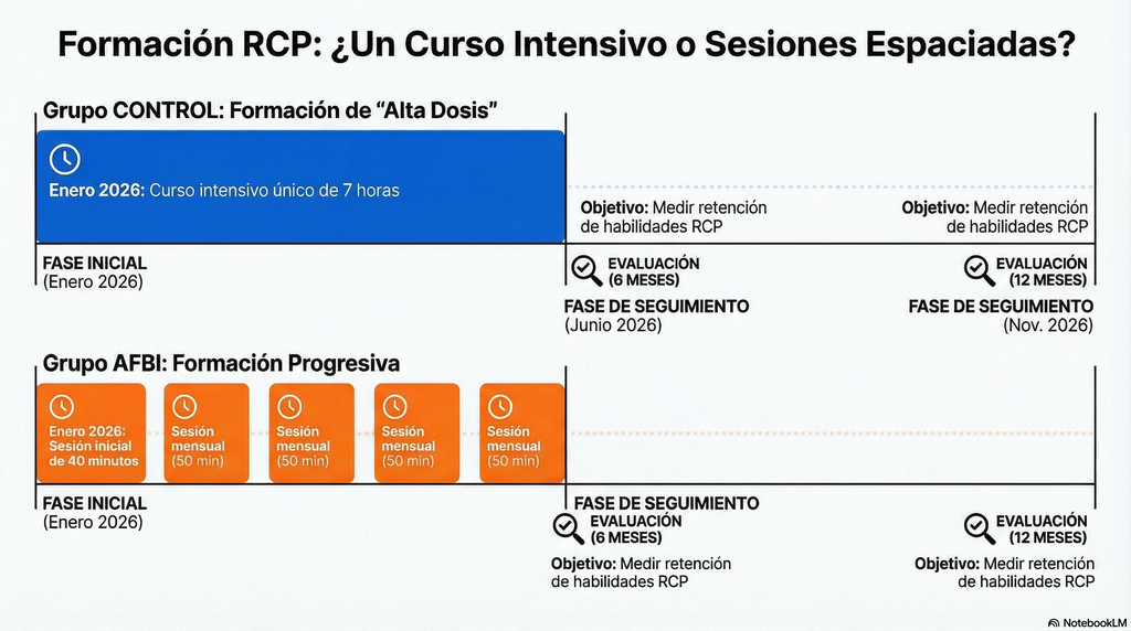 AFBI-RCP es un ensayo clínico aleatorizado que tiene como objetivo determinar qué tipo de formación resulta más eficaz para mantener, a lo largo del tiempo, las competencias técnicas relacionadas con la reanimación cardiopulmonar (RCP) de alta calidad.