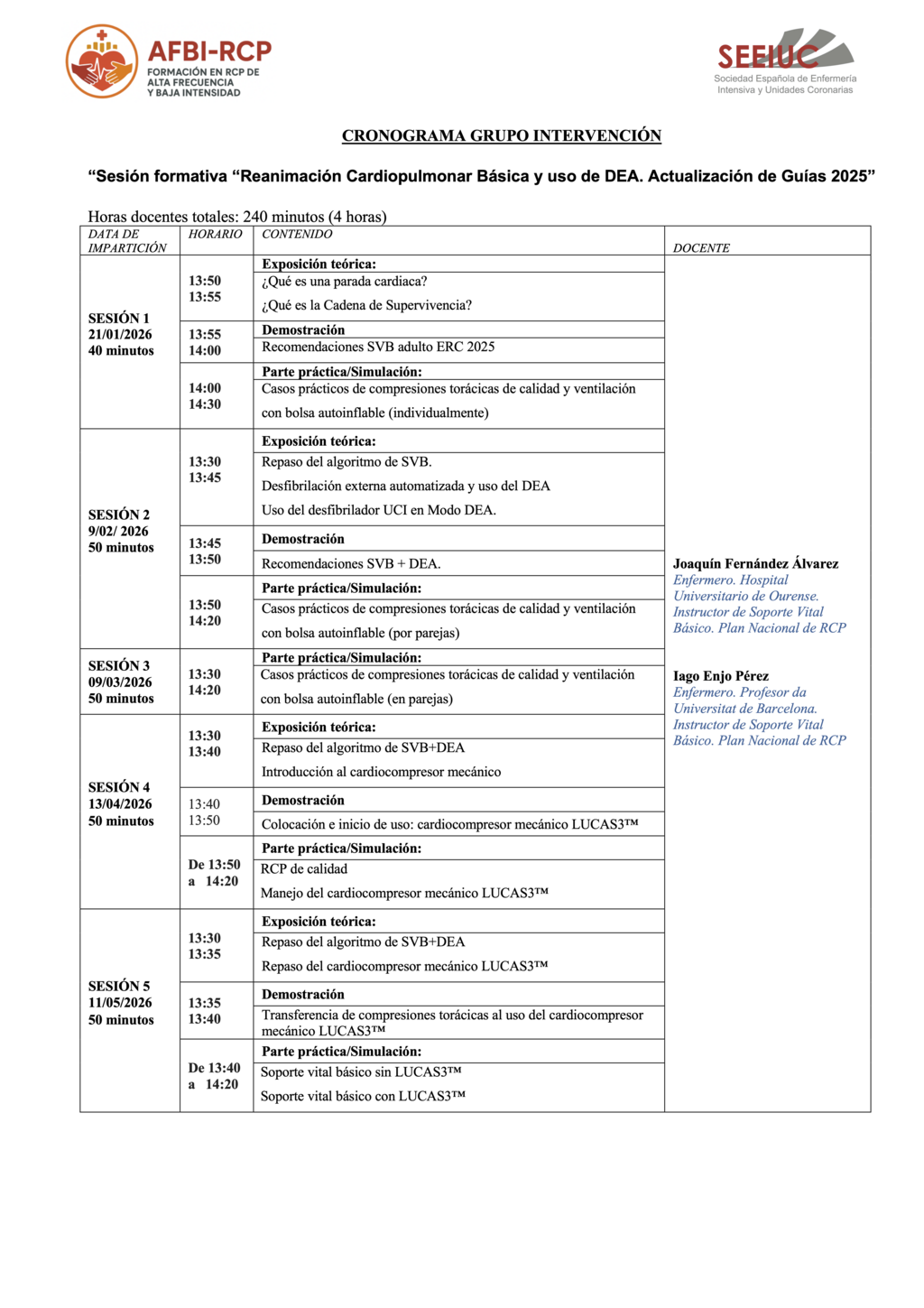 AFBI-RCP es un ensayo clínico aleatorizado que tiene como objetivo determinar qué tipo de formación resulta más eficaz para mantener, a lo largo del tiempo, las competencias técnicas relacionadas con la reanimación cardiopulmonar (RCP) de alta calidad.